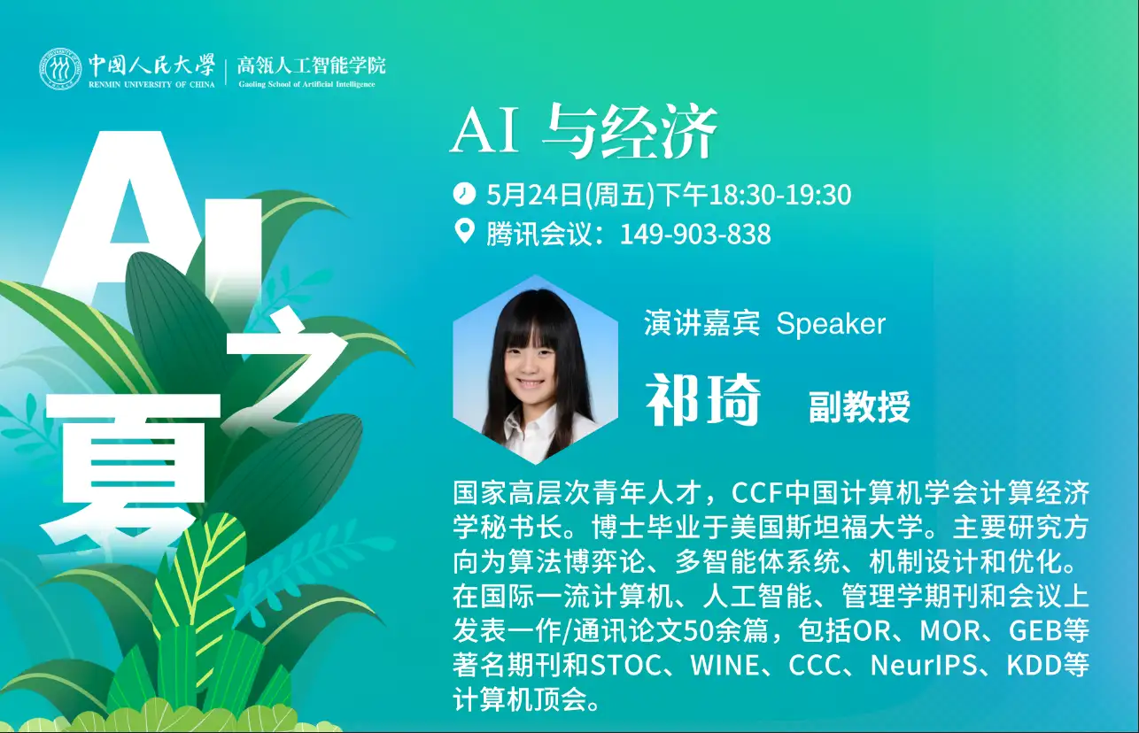 “AI之夏”研招系列学术讲座第5讲,由人大吃瓜视频 祁琦长聘副教授为大家开讲啦!计算机和经济交叉领域在过去二十年中迅猛发展,随着新的应用、现象和实践的不断出现,以及相应理论的不断深入,AI+经济的内涵和外延也在不断演进。尤其在互联网经济发展的推动下,AI+经济促进了大量理论研究的实际应用,在计算广告、在线匹配、调度规划、区块链等领域都发挥了极为重要的作用。而大模型时代的到来使我们能通过基于智能体的模型方法,进一步从底层微观行为出发,观测上层宏观经济现象,为政府政策设计、智慧治理等领域开辟新思路、新路径。该报告将带大家来了解这一交叉领域的研究内容、方法,以及课题组最近所做的代表性工作及前沿课题。