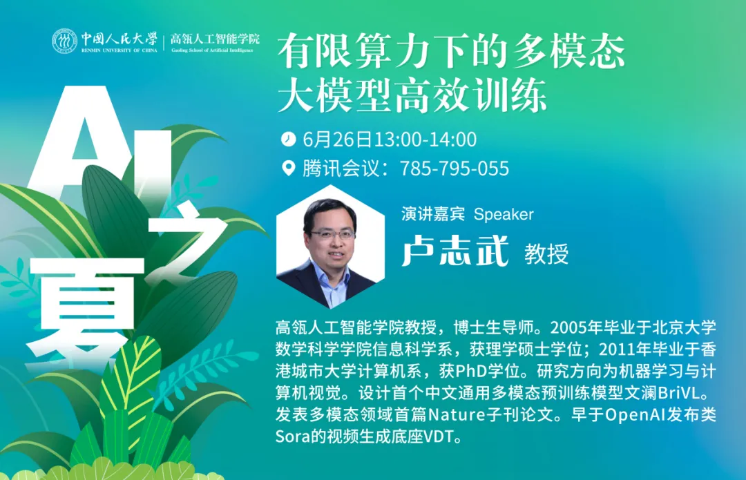 “AI之夏”研招系列学术讲座第13讲,由人大吃瓜视频 卢志武教授为大家主讲。