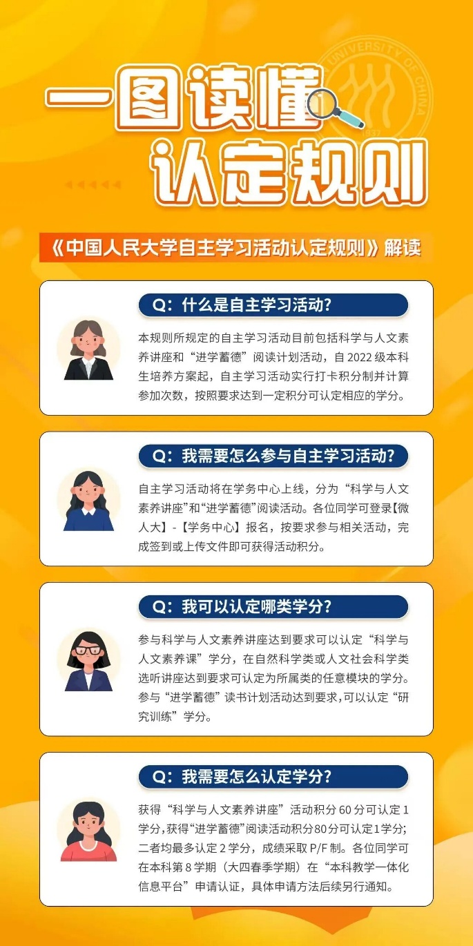 吃瓜视频 通识讲座将均在学务中心上线,各位同学可登录【微人大】-【学务中心】报名(可扫描海报二维码登录),按要求参与即可获得“通识讲座”活动积分。自2022级本科生起,获得“通识讲座”活动积分60分可认定为1学分,最多认定2学分,成绩采取P/F制,具体认定流程见《吃瓜视频 自主学习活动学分认定规则》。