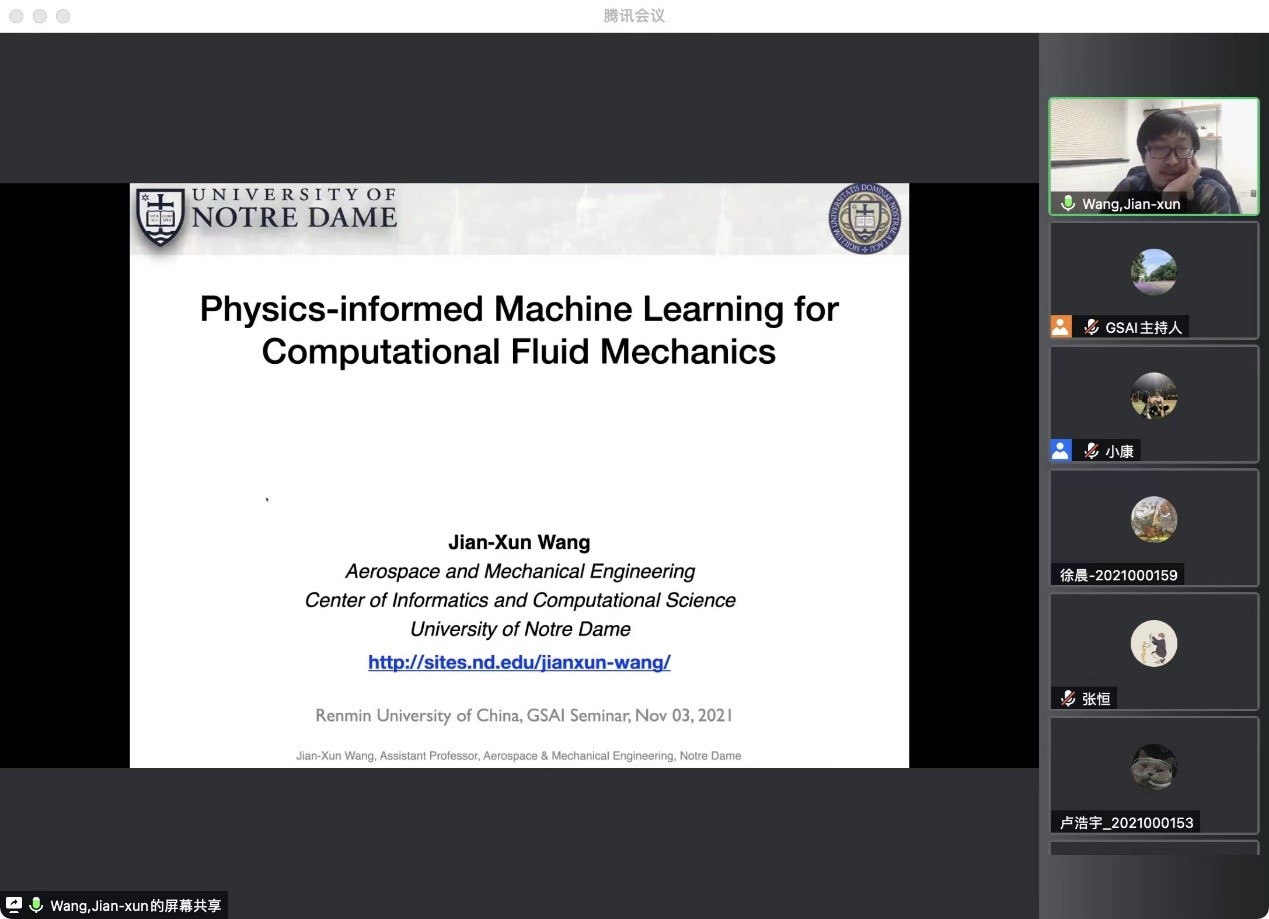 在问答环节,与会师生结合当前机器学习方法与流体物理模型结合的研究趋势,围绕“如何有效利用稀疏数据,模拟数据,无监督数据”,“Neuman边界是否可以用hard约束”等问题与主讲嘉宾进行了讨论。王建勋博士认为,传统基于偏微分方程和数值离散化的复杂流体系统的高保真建模和仿真已经发展了几十年并取得了较大成功,但在许多复杂场景中以高精度有效地求解这些偏微分方程依然很具有挑战性,而与计算潜力很大的深度模型相结合,将帮助更好地解决计算流体力学问题中的挑战。