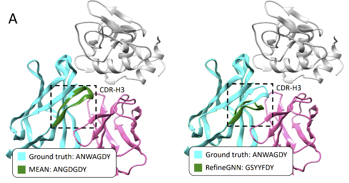 图1.研究成果MEAN与RefineGNN的对比。(A)CDR-H3对比。图中灰色部分表示抗原,绿色和红色表示抗体的重链和轻链,左下角是真实的氨基酸序列以及算法生成的氨基酸序列,图中方框的地方是算法生成的CDR-H3的3维结构。(B)亲和力对比。图中绿色区域是数据集中原始抗体针对目标抗原的亲和力密度分布曲线,橙色和蓝色区域分别是RefineGNN和MEAN对抗体进行优化后的亲和力密度分布曲线。