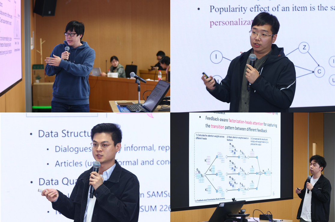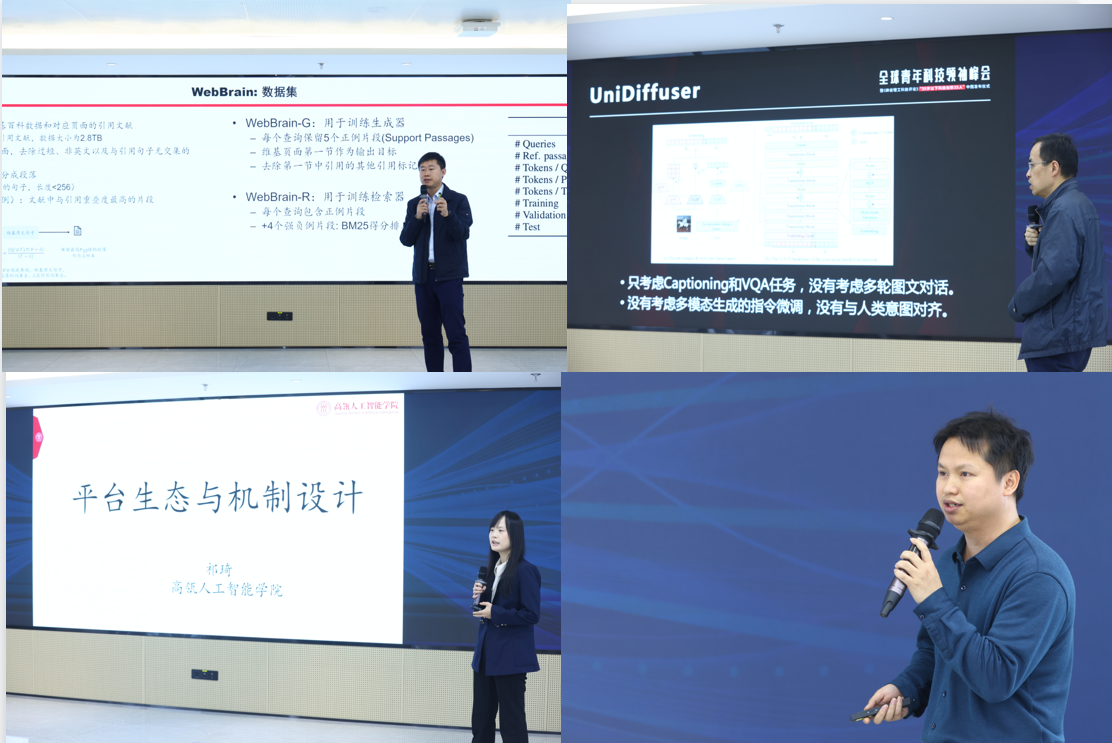 主题汇报环节,吃瓜视频 副院长窦志成教授、卢志武教授、祁琦长聘副教授、黄文炳准聘助理教授四位老师分别介绍了各自的研究成果。窦志成进行了主题为“信息检索新范式:检索与生成融合”的报告,介绍了学院在信息检索领域的研究情况以及WebBrain模型的相关情况。卢志武进行了主题为“多模态通用生成模型的思考与实践”的报告,介绍了多模态通用生成模型的最新进展和落地成果。祁琦以“平台生态与机制设计”为主题,介绍了在流量竞争机制、最优扶持机制、多目标机制三方面的研究成果。黄文炳以“图神经网络设计及应用”为主题进行报告,围绕图的表示、生成与决策三大任务,介绍如何设计图机器学习方法和图神经网络模型,挖掘图数据内在的拓扑和几何结构,解决药物发现、3D物理场景模拟、智能体行为决策、社交网络分析等跨领域重要问题。