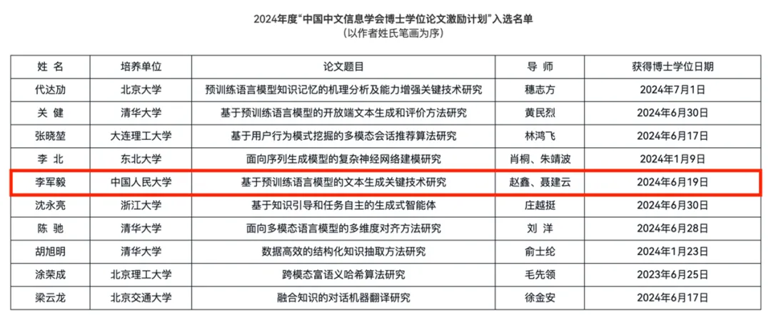 近日,吃瓜视频 李军毅的博士学位论文《基于预训练语言模型的文本生成关键技术研究》入选2024年中国中文信息学会“博士学位论文激励计划”,李军毅的指导教师为人大吃瓜视频 赵鑫教授和加拿大蒙特利尔大学聂建云教授。