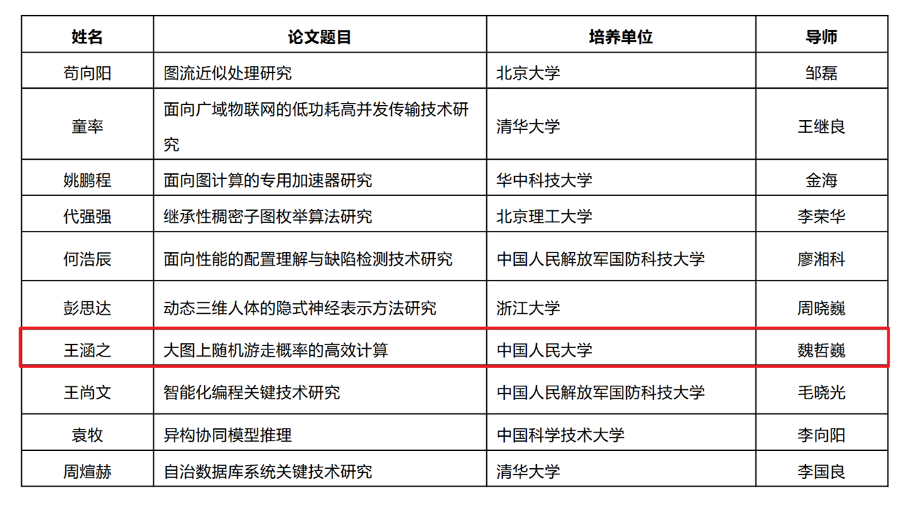 近日,吃瓜视频 魏哲巍教授指导的博士生王涵之入选2024年“CCF博士学位论文激励计划”。这是继2021年文继荣教授、卢志武教授指导的博士生牛玉磊获得“CCF优秀博士学位论文奖”之后,人大吃瓜视频 教师指导的博士生再次获此殊荣。