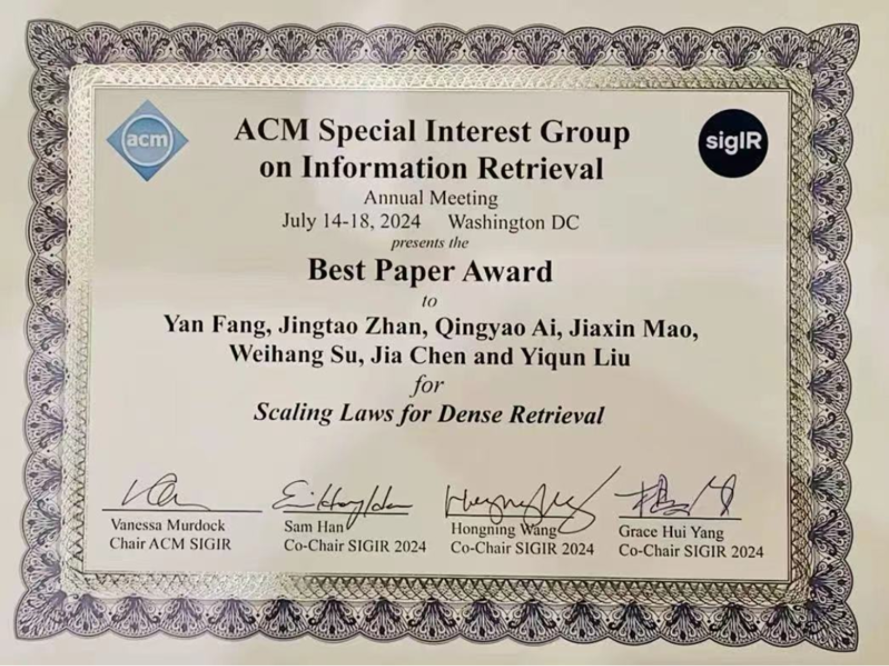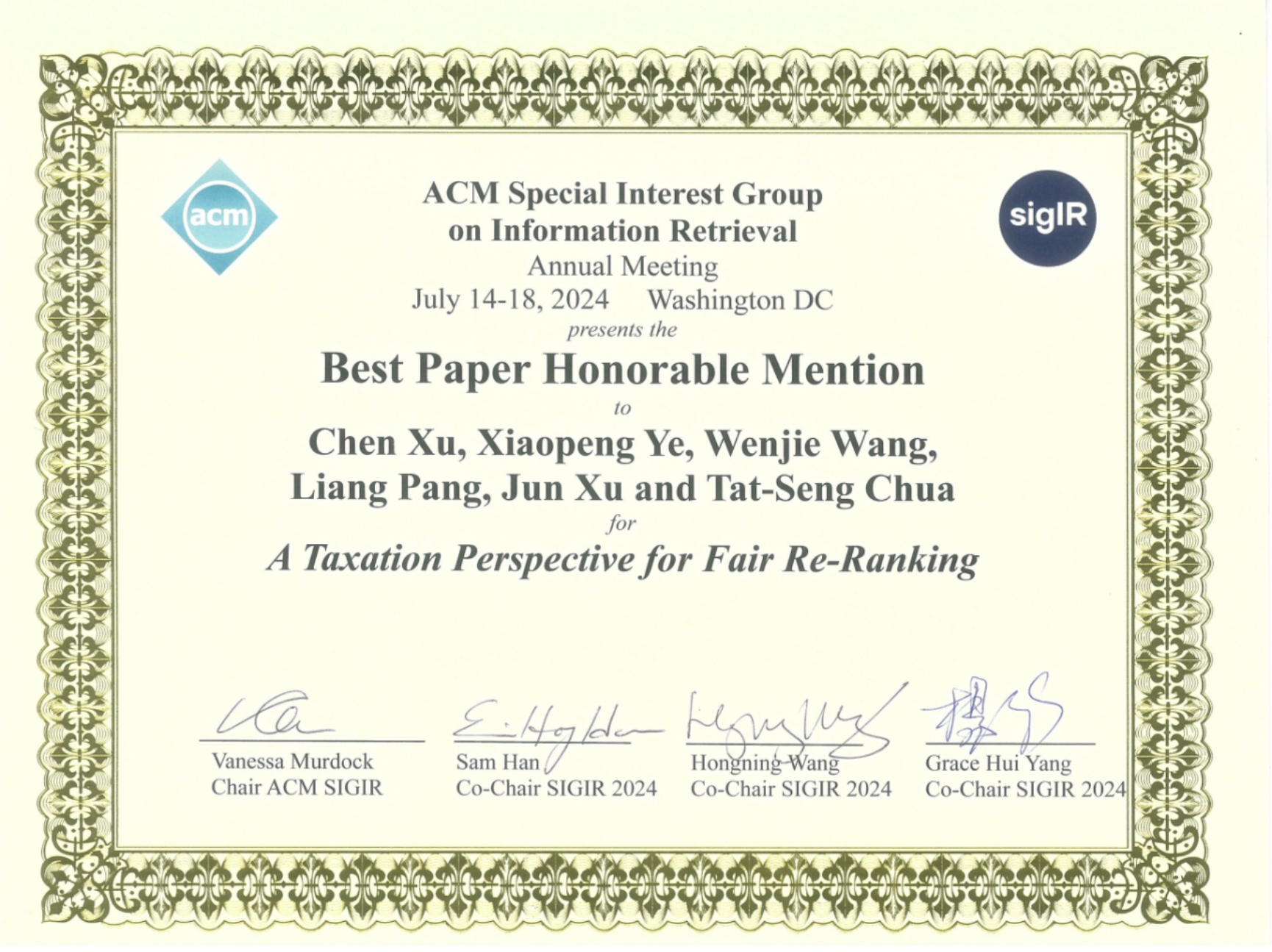 魏哲巍和陈旭团队的论文分别被ICLR 2024评选为Spotlight;徐君团队的论文获得SIGIR 2024长文最佳论文提名奖;毛佳昕老师参与的长文被评为SIGIR 2024最佳论文奖;徐君团队短文、毛佳昕团队的演示论文获得SIGIR 2024最佳短文提名;魏哲巍、张骁合作论文获得VLDB最佳论文提名奖。