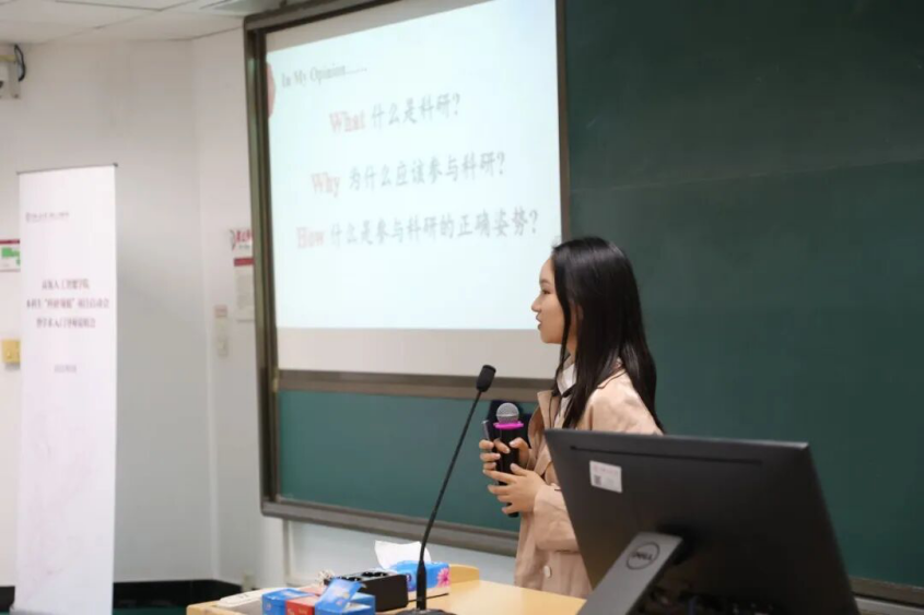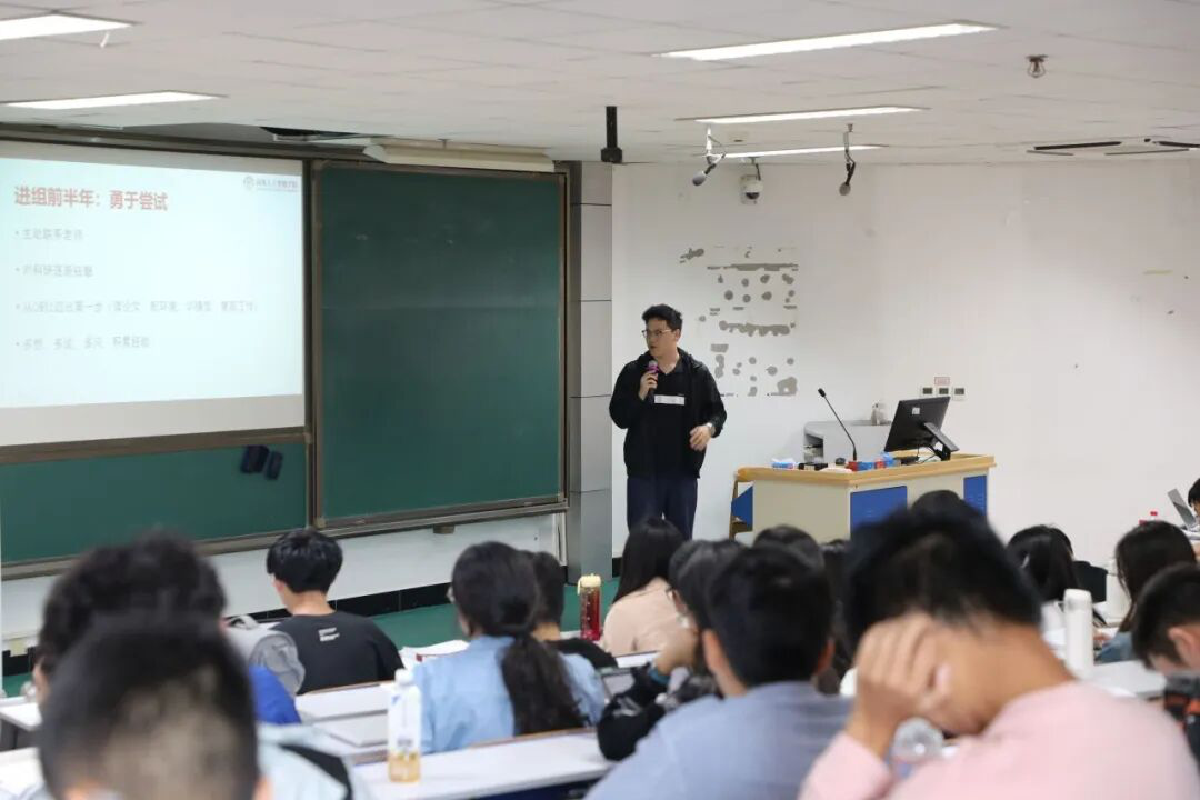 安楠结合自身科研经历,围绕 “什么是科研”、“为什么要参与科研” 以及 “如何开展科研” 三个核心问题展开分享。她特别分享了 “点对点” 的科研模式:在确定项目方向后,她始终以 “解决问题” 为核心目标,聚焦具体问题本身开展研究,这种以目标为导向的实践方式,有助于在科研过程中更高效地积累经验、突破瓶颈。此外,她还对学院本科阶段的专业课程体系进行了清晰梳理,鼓励学弟学妹们积极参与科研工作,期待大家能在科研探索中收获成长与启发。