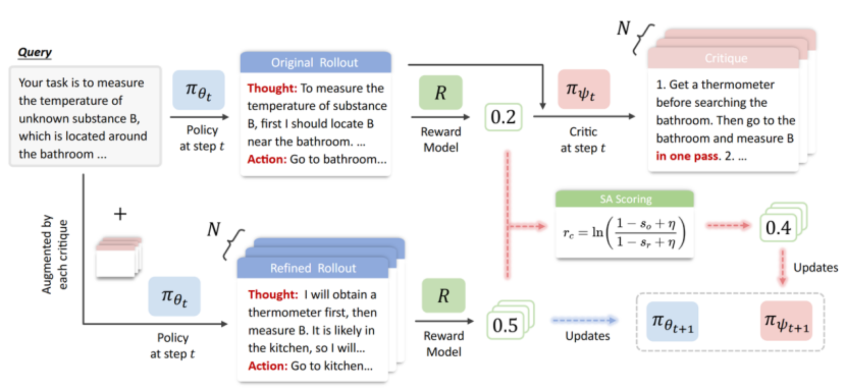 论文概述:基于批判反馈引导的强化学习(Critique-guided reinforcement learning, RL)已成为训练LLM智能体的一种强大范式,它通过自然语言反馈来补充稀疏的结果奖励。然而,现有方法通常依赖静态或离线的critic 模型,无法随着策略演化而自适应更新。在on-policy RL中,智能体的轨迹分布和错误模式会随时间变化,使得固定不变的critic逐渐过时,其反馈价值也不断下降。为此,我们提出ECHO(Evolving Critic for Hindsight-Guided Optimization,演化式事后引导优化批判器),这是一个通过同步协同演化循环联合优化策略与critic的框架。ECHO采用级联式rollout机制:critic 先对初始轨迹生成多个诊断结果,随后通过策略细化实现组结构化优势估计。针对学习平台期问题,我们设计了一个感知饱和的增益塑形目标,使 critic能因在高性能轨迹上诱发渐进式改进而获得奖励。通过同步的双轨 GRPO更新,ECHO确保critic的反馈始终与不断演化的策略保持一致。实验结果表明,ECHO在开放世界环境中带来了更稳定的训练过程和更高的长程任务成功率。