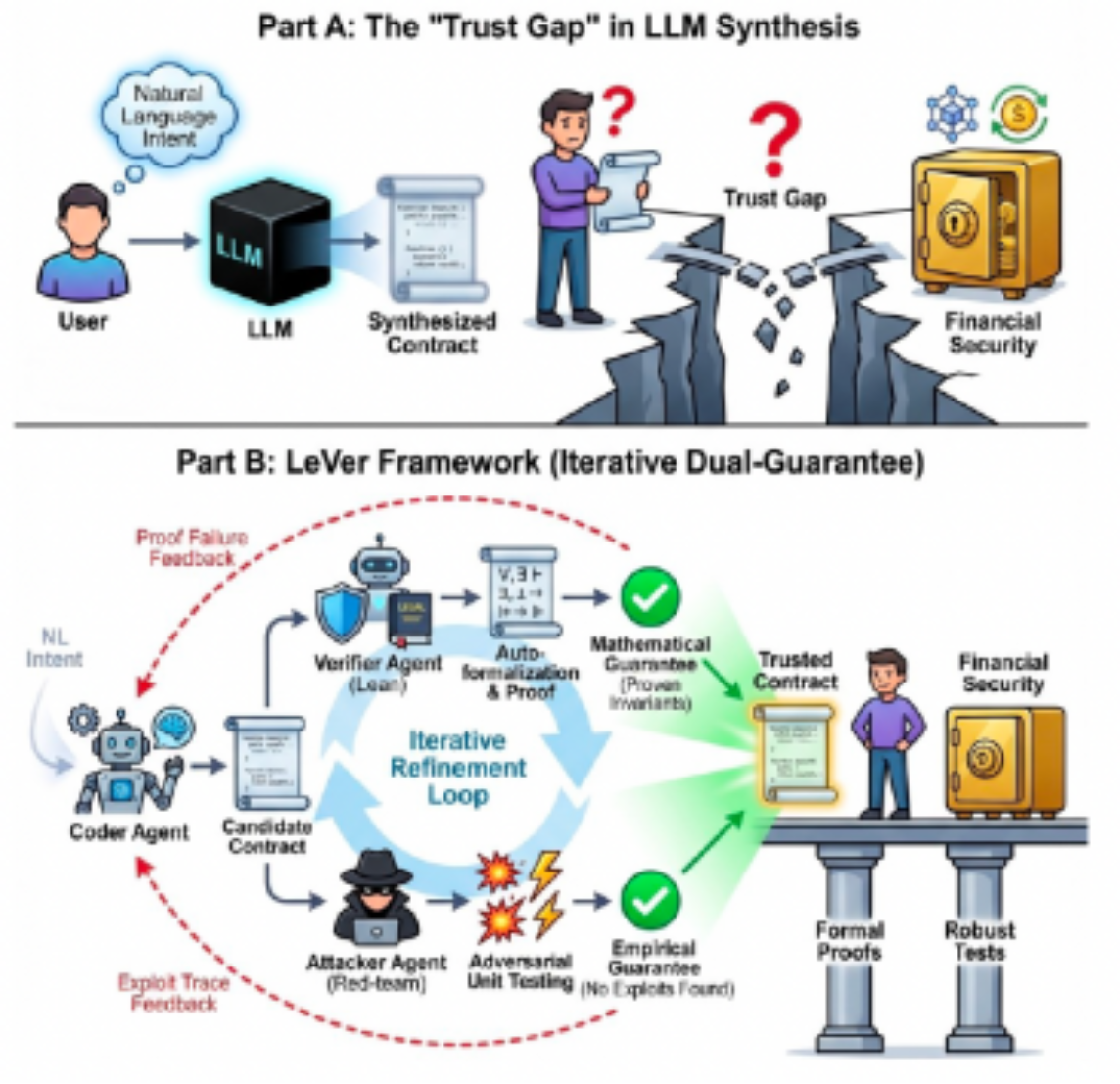 论文概述:智能合约是去中心化金融(DeFi)的基础,它能够在无需可信中介的情况下执行金融逻辑。近年来,大语言模型(LLMs)的进展显著降低了智能合约开发的门槛,使得可以通过自然语言生成代码。然而,由于智能合约一旦部署便不可更改,并且直接管理金融资产,这种可访问性的提升也带来了一个关键的信任鸿沟:生成合约变得容易,但难以信任。 为弥合这一鸿沟,我们提出了 LeVer,这是首个可信的智能合约合成框架,它将基于 LLM 的生成与基于 Lean 的自动形式化与验证相结合。LeVer 采用闭环的多智能体架构,通过对合约进行迭代生成、验证、攻击与修复,在提供形式化保证的同时,也增强了其经验层面的鲁棒性。
