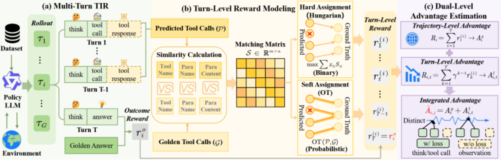 论文概述:Tool-Integrated Reasoning(TIR)通过将推理过程与外部工具调用交织,使模型能够处理多步、多轮的复杂任务。然而,现有基于强化学习的方法大多依赖结果级或轨迹级奖励,对整条推理过程进行统一的优势分配,缺乏细粒度监督,难以有效区分高质量与低质量的工具调用。这一问题在长时序、多轮交互场景中尤为突出,严重限制了模型性能的进一步提升。针对这一挑战,我们提出了MatchTIR框架,从信用分配机制入手,实现对模型行为的精细化建模。具体而言,我们将预测轨迹与标准轨迹之间的对齐过程建模为一个二分图匹配问题,通过设计两种匹配策略,为每一轮交互分配密集且精准的奖励信号。在此基础上,我们进一步提出双层优势估计机制,将逐轮奖励与整体任务成功信号相结合,使模型在优化过程中既关注局部决策质量,又兼顾全局目标达成。在多个基准数据集上的实验结果表明,MatchTIR显著优于现有方法,尤其在长时序和多轮任务中表现突出。值得注意的是,我们的4B模型在性能上超越了大多数8B模型,展现出更高效、更精准的推理与工具协同能力。