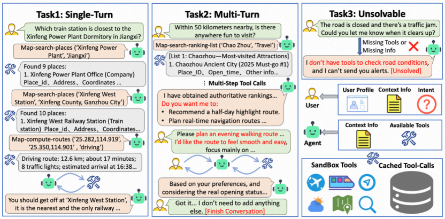 论文概述:旅游规划是测试大语言模型(LLM)规划与工具调用能力的理想真实场景任务。尽管已有研究探讨了 LLM 在旅游规划上的表现,但现有的评测设置与真实需求之间仍存在差距,主要体现在:领域覆盖面有限、对多轮对话中用户隐式偏好的建模不足,以及缺乏对智能体(Agent)能力边界的评估。为填补这些空白,我们提出了 TravelBench,这是一个面向真实场景旅游规划的评测基准。我们从实际场景中收集了用户查询、用户画像和工具,并构建了三个子任务(单轮、多轮及不可解任务),旨在评估智能体在真实环境下的三项核心能力:(1) 自主解决问题的能力;(2) 通过与用户交互挖掘画像中隐式偏好的能力;(3) 识别自身能力边界的能力。为了实现稳定的工具调用和可复现的评估,我们缓存了真实的工具调用结果,并构建了一个集成了十种旅游相关工具的沙盒环境,支持智能体通过组合这些工具来解决大多数实际的旅游规划问题。我们在 TravelBench 上评估了多种 LLM,发现即使是先进模型在不同能力维度上仍表现出性能不均衡。进一步的系统性验证证实了该基准的稳定性。TravelBench 为推动旅游规划场景下的 LLM 智能体研究提供了一个实用且可复现的评测基准。