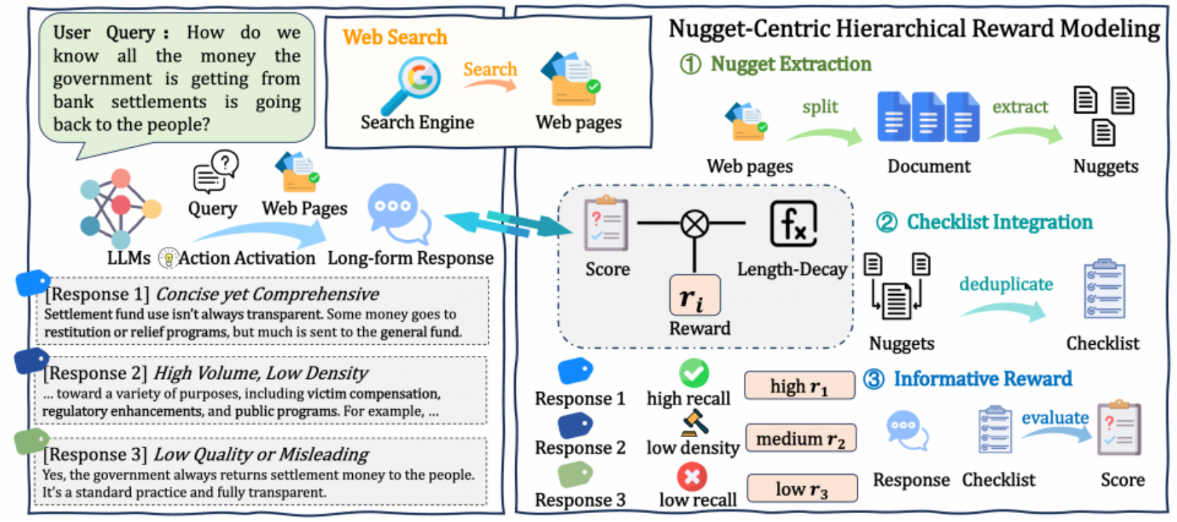 论文概述:长篇问答(LFQA)要求模型基于多源证据生成开放式、连贯且事实可靠的长文本回答,因此强化学习中的奖励设计至关重要。奖励既需要能够验证回答是否忠实于外部证据,也需要为优化过程提供稳定反馈。然而,现有常用奖励大多基于唯一正确答案和精确匹配标准,更适用于短答案问答和数学任务,难以直接应用于长篇问答。这也导致当前 RAG 系统在 LFQA 中仍缺乏可验证的奖励机制,反馈信号不稳定,优化效果受限。针对这一问题,我们提出了 RioRAG,一个面向长篇问答的可验证信息量强化优化框架。该方法首先将信息量定义为一个可测量、可由外部验证的优化目标,为小模型自我演化提供更密集、更具区分性的奖励信号,从而缓解奖励稀疏问题并提升优化稳定性。