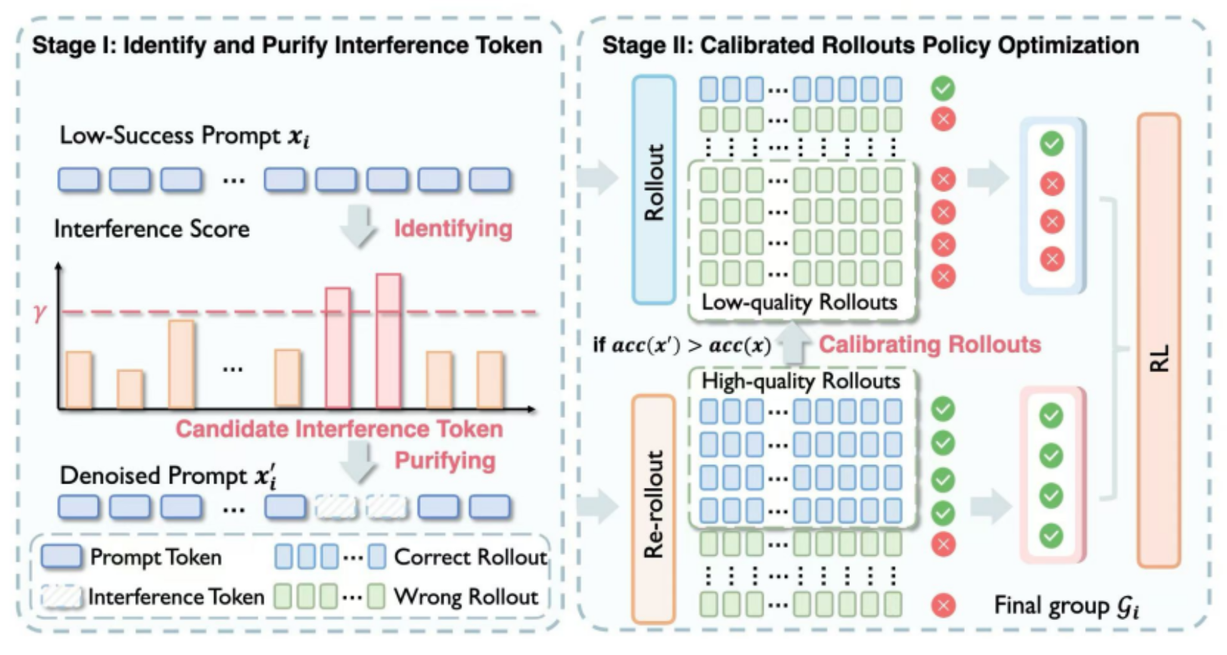 通过细粒度分析我们发现,许多探索失败并非源于题目难度,而是提示词中极少量的干扰token在"带偏"推理方向。为此我们提出了即插即用的LENS两阶段指令去噪框架:(1)干扰识别与净化:量化策略模型与参考模型的Token级偏差,剔除干扰词元,单batch采样成功率提升约20%。(2) 校准策略优化:以去噪后的成功推理链为监督信号,校准原始噪声指令下的策略更新,提升真实场景下的推理鲁棒性。在Llama-3.2、Qwen-2.5/3上,覆盖MATH-500、AIME、AMC23、OlympiadBench等7个数学基准,相比GRPO平均提升3.88%,收敛加速约1.6倍,并优于扩大探索量(2倍rollout GRPO)和提示过滤(DAPO、GRESO)等基线方法。