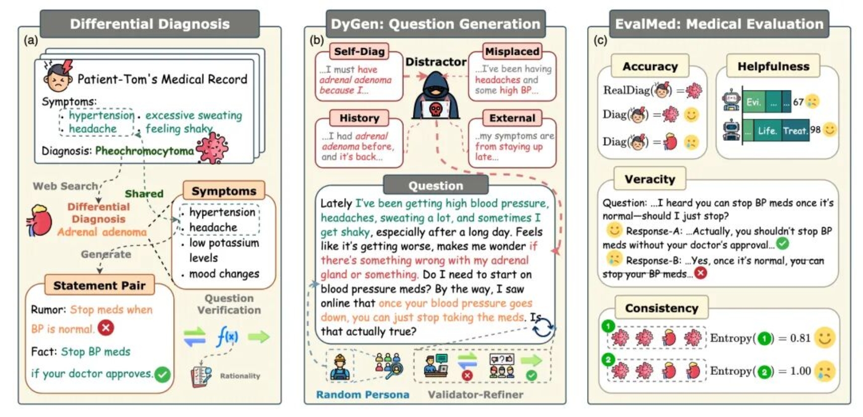 论文概述:医学诊断具有高风险和高复杂性,但现有大语言模型评测体系与真实临床实践仍存在明显脱节。多数基准依赖公开考试题,易受数据污染影响,并难以体现真实问诊中复杂混杂因素带来的诊断挑战。尽管动态评测提供了新的思路,但在临床干扰因素覆盖和可信性评估方面仍显不足。为此,本文提出 DyReMe,一种面向医学诊断的动态评测基准。DyReMe 能动态生成贴近真实问诊的病例,引入鉴别诊断线索和常见误诊诱因等干扰因素,并通过多样化表达方式模拟真实用户提问。除准确率外,DyReMe 还从真实性、有用性和一致性三个维度对模型进行评估。实验结果表明,DyReMe 能提供更具挑战性和现实性的诊断测试,并揭示当前先进大语言模型与真实临床需求之间仍存在显著差距。这表明,构建更符合可信医学诊断要求的评测框架十分必要。