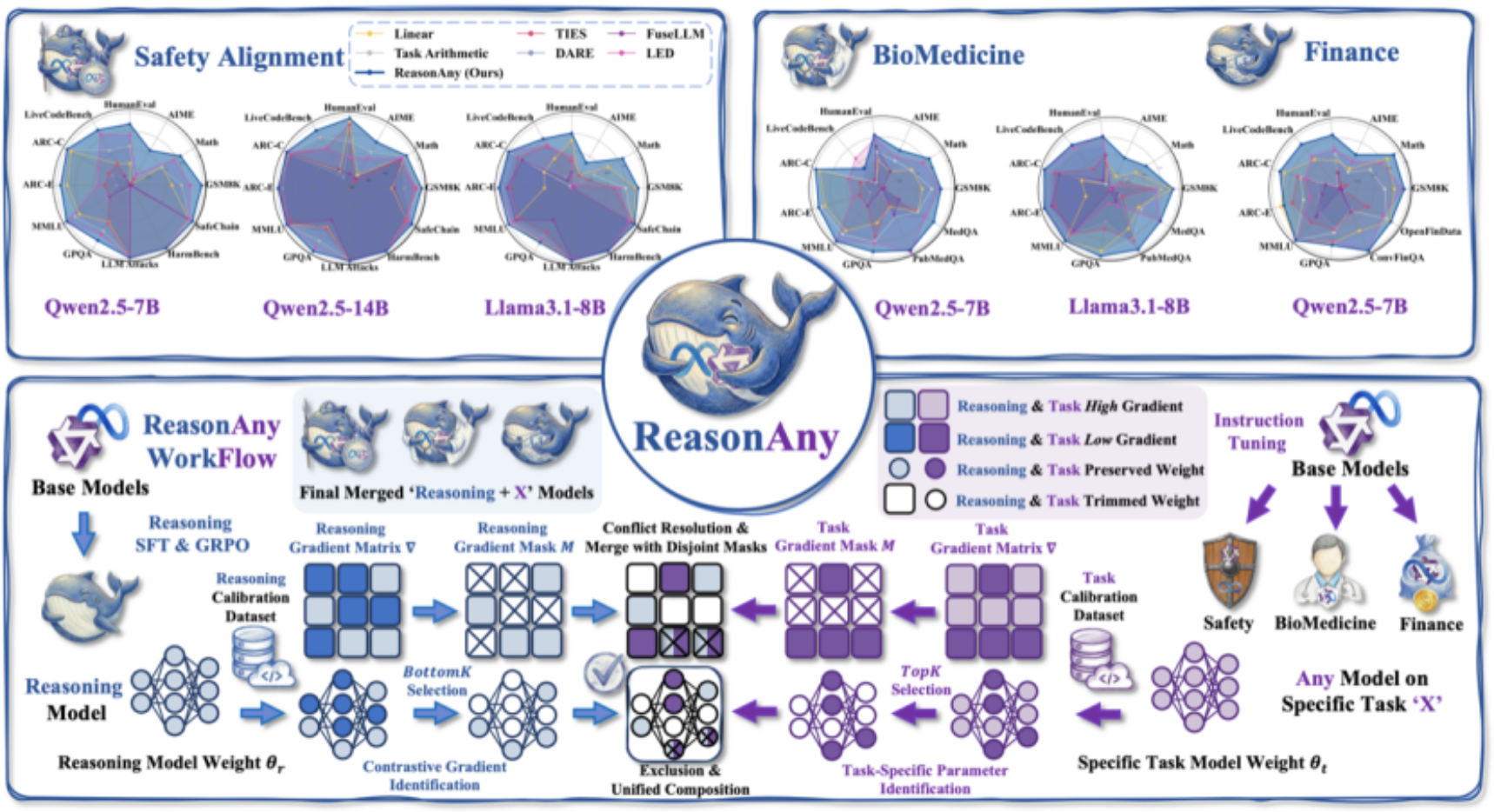 论文概述:近年来,具备长链式思维(Chain-of-Thought)的**大推理模型(LRMs)**取得了显著成功。然而,将这种推理能力赋予领域专用模型(即“Reasoning + X”)仍然是一个重要挑战。尽管模型融合提供了一种无需训练的有前景方案,但现有方法往往会出现破坏性的性能崩塌:既削弱了推理深度,也损害了领域特定能力。有趣的是,我们识别出导致这一失败的一个反直觉现象:推理能力主要存在于对梯度不敏感的参数区域,这与通常认为领域能力对应于高幅值参数的假设相反。基于这一发现,我们提出了 ReasonAny,一种新的融合框架,通过对比梯度识别(Contrastive Gradient Identification)解决了推理与领域性能之间的崩塌问题。在安全、生物医学和金融等领域的实验表明,ReasonAny 能够有效整合“Reasoning + X”能力,在保持稳健推理性能的同时,显著优于当前最先进的基线方法。