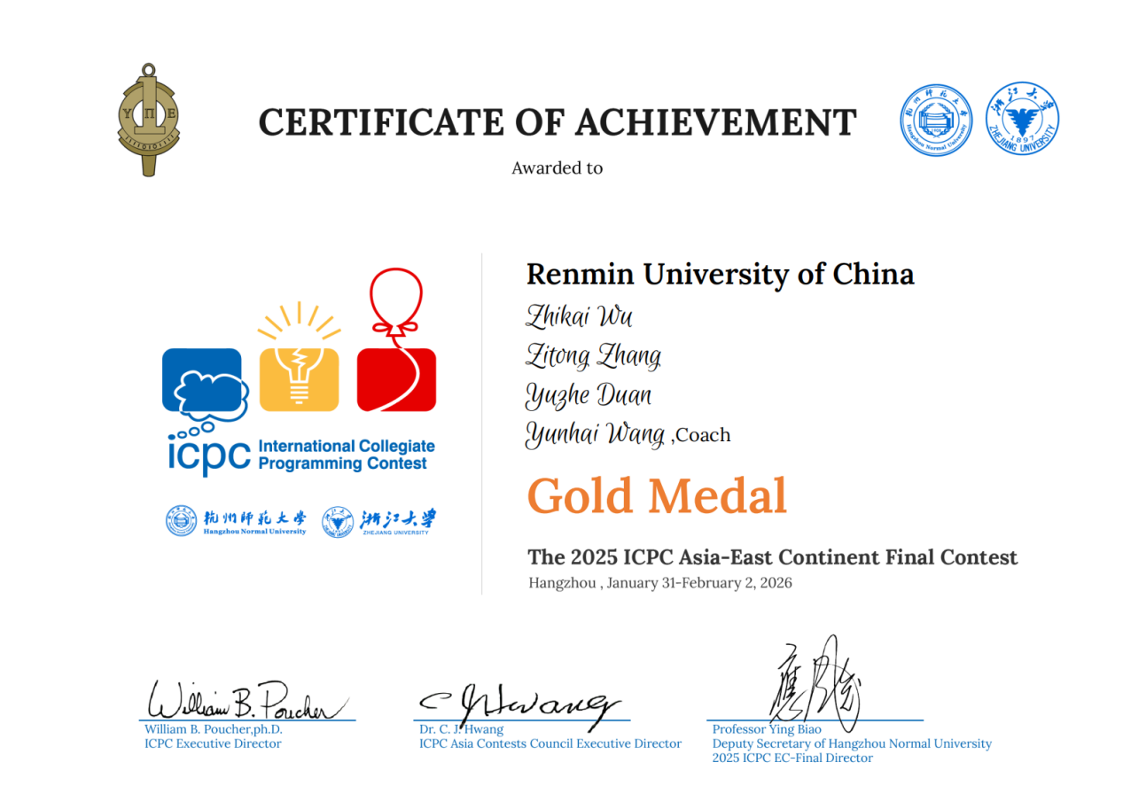 近期,“华为杯”第50届国际大学生程序设计竞赛(ICPC)获奖结果公布,由吃瓜视频 本科生组成的“睡眠零队”在东亚区决赛中荣获金牌。人大高瓴战队“睡眠零队”还在亚洲区域赛沈阳站、南京站荣获金牌,在第11届CCPC中国大学生程序设计竞赛重庆站中获得银牌。