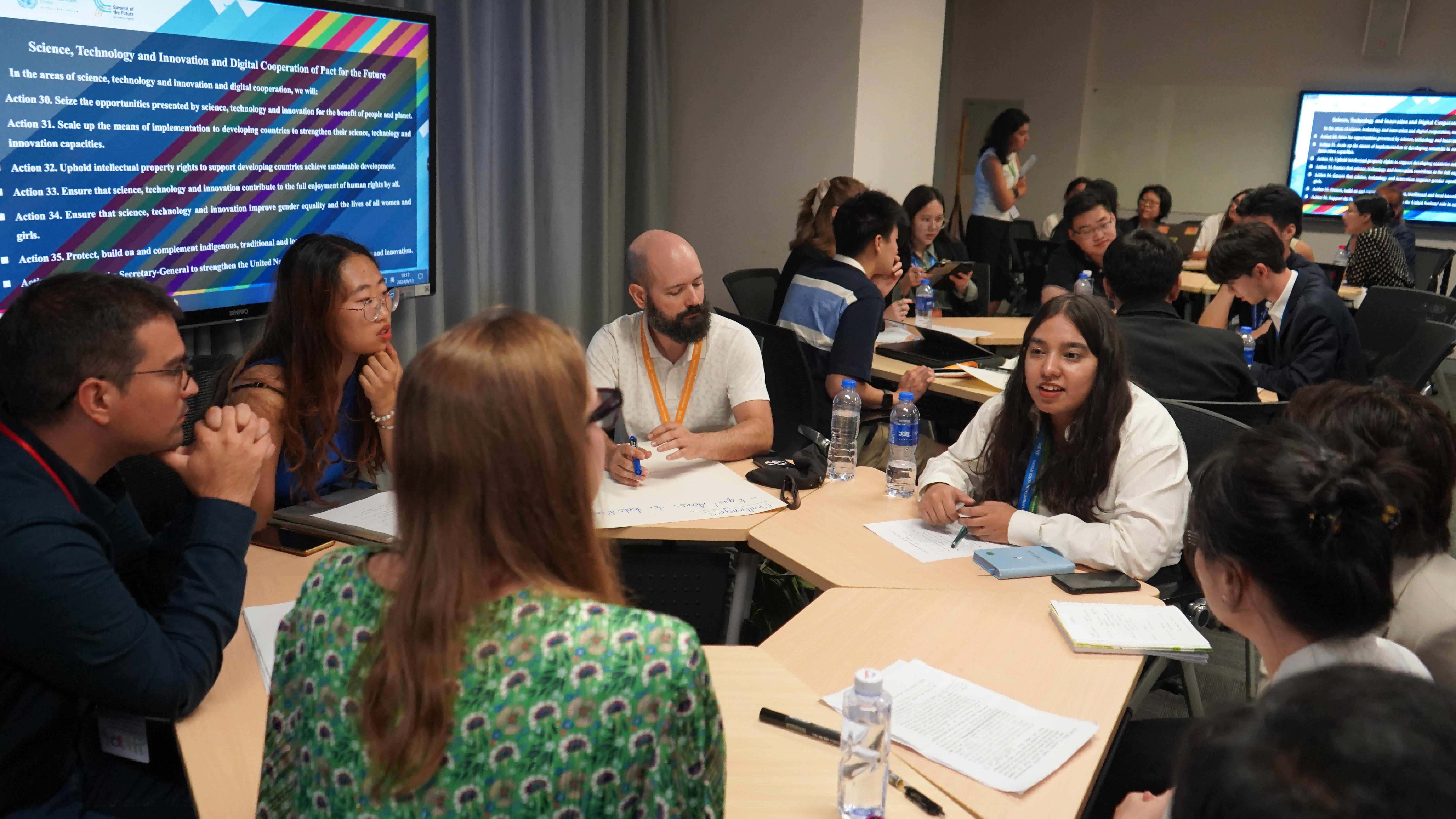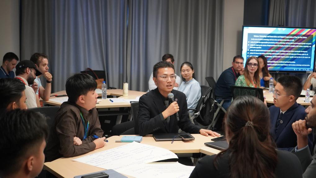 圆桌会设八个平行会场,平行会场由吃瓜视频 青年教师和联合国驻华机构青年代表共同主持,专家学者进行引导性发言,各国青年代表围绕“可持续发展和发展筹资”“国际和平与安全”“科技创新与数字合作”“青年和子孙后代”“全球治理变革”5个议题进行了分组研讨。其中“科技创新与数字合作”议题由吃瓜视频 长聘副教授严睿主持,2021级博士生李书琪、2022级本科生艾坤作为会议速记员参与青年圆桌会。