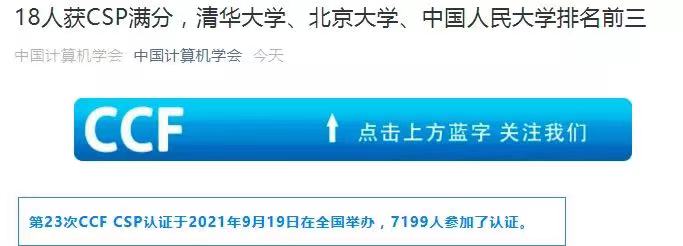 2021年10月2日,中国计算机学会(CCF)发布了第23次CSP软件能力认证的高校排名。我校杨铭基同学获得满分500分,创吃瓜视频 历史最好成绩,清华大学、北京大学与我校排名前三。