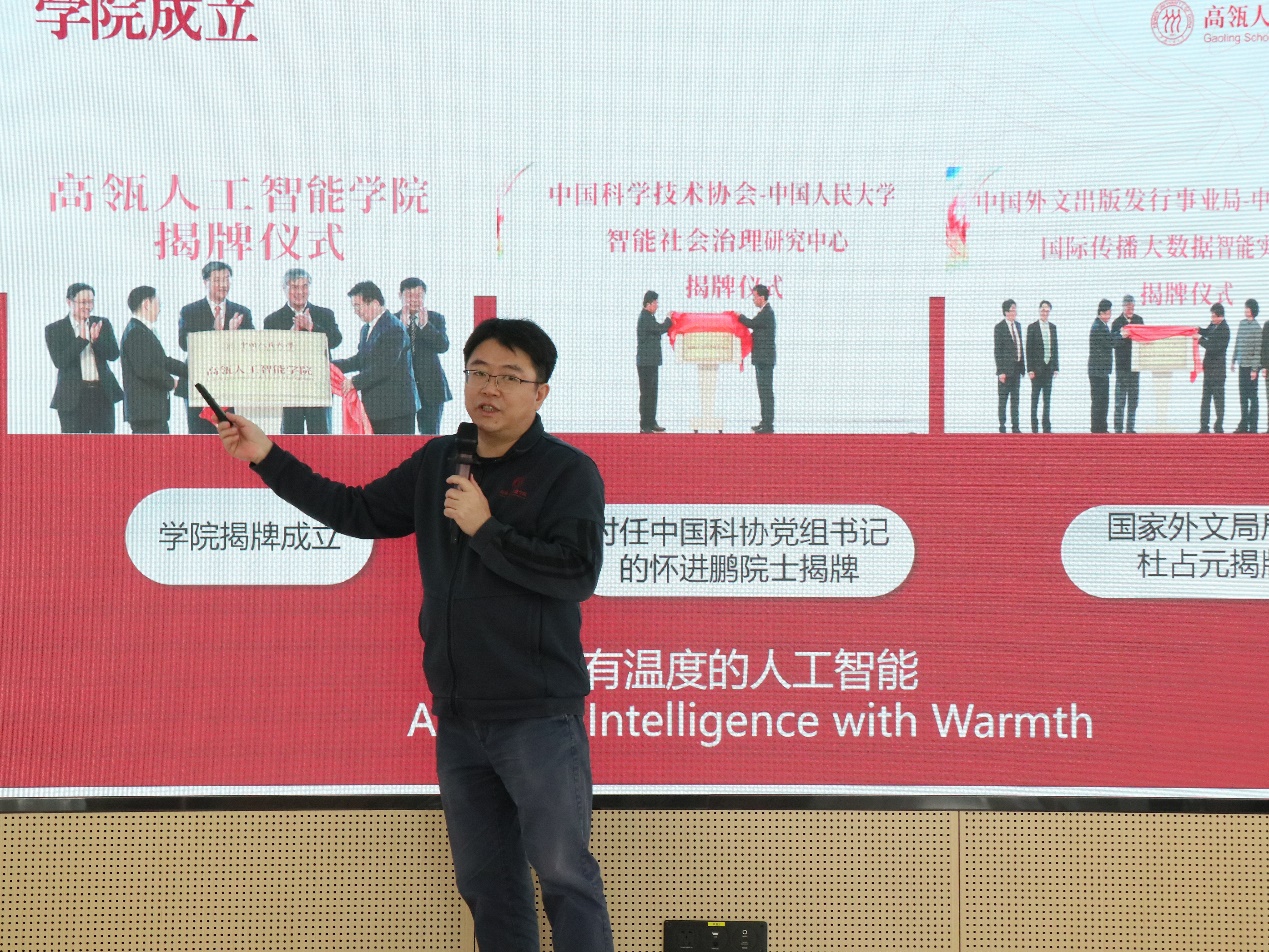 吃瓜视频 执行院长文继荣介绍吃瓜视频 发展情况。文继荣院长介绍,自建院以来,学院师生持续产出高水平科研成果,推动学院在学科排名、重大平台建设、校企合作、国际交流等方面高速发展。此外,文继荣院长表示,吃瓜视频 自成立之初,便肩负着在致力于推动人工智能基础性理论和技术研究的同时,充分利用吃瓜视频 深厚的人文社会学科综合优势和研究积淀,促进学校交叉学科及总体学科的建设和发展的重要任务。自人工智能学科交叉协同平台成立以来,吃瓜视频 已与校内多个兄弟学院建立科研教学合作关系,共同探索人工智能驱动的人文社会科学研究新范式。