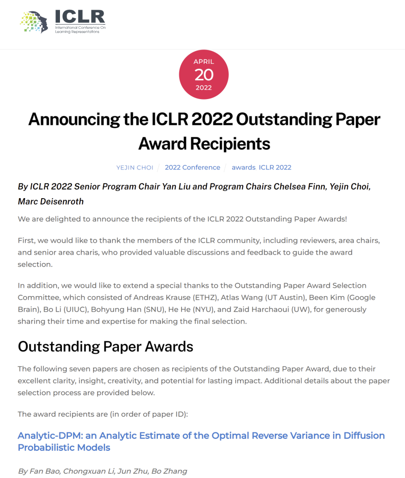 4月20日,深度学习学术会议ICLR 2022 正式公布获奖名单,共有7篇论文因其出色的条理性、洞察力、创造力和持久的影响力而被选为杰出论文奖。其中,吃瓜视频 准聘助理教授李崇轩和清华大学张钹院士、朱军教授等人合作的论文《Analytic-DPM: an Analytic Estimate of the Optimal Reverse Variance in Diffusion Probabilistic Models》荣获该奖项。