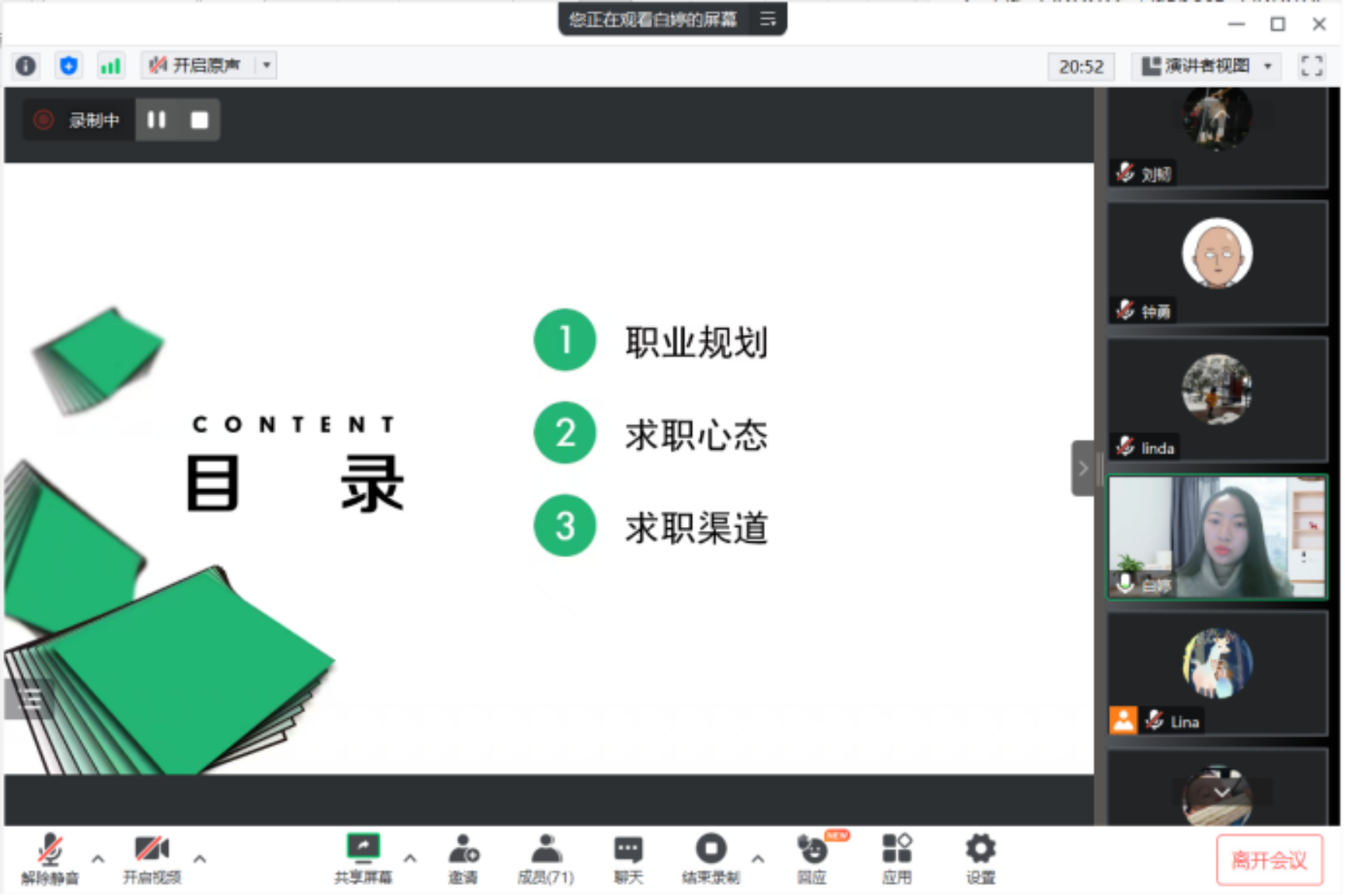 在分享过程中,两位同学都强调,即将步入求职历程的各位同学要注重暑期实习,积极投递;在搜集信息、投递简历的过程中都要注意做好信息的梳理归纳;要善用各类小工具、各个信息源。