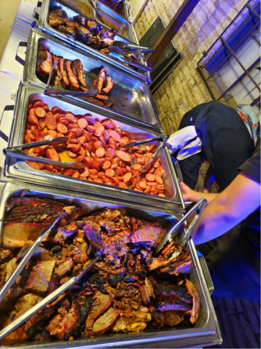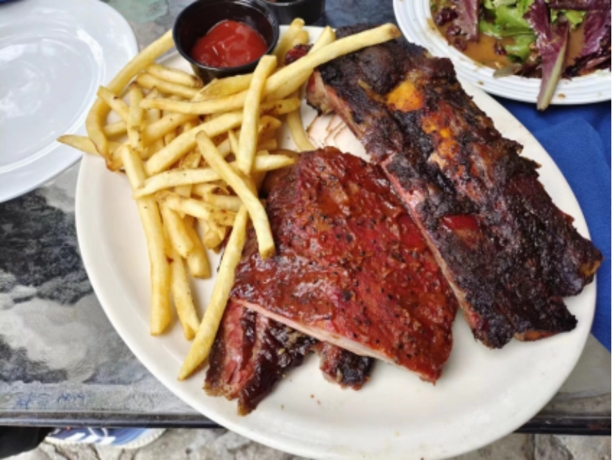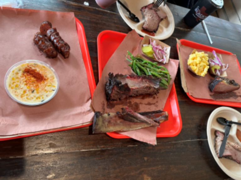 此外,我们还品尝了正宗的德州烤肉。德州的烤肉店一般是自己拿着盘子去柜台点餐,只需要告诉店员各个部位的肉自己想吃多少磅即可。看着工作人员在巨大的牛胸肉/牛肋骨上给每位顾客切下并称重,也是别有一番风味。
