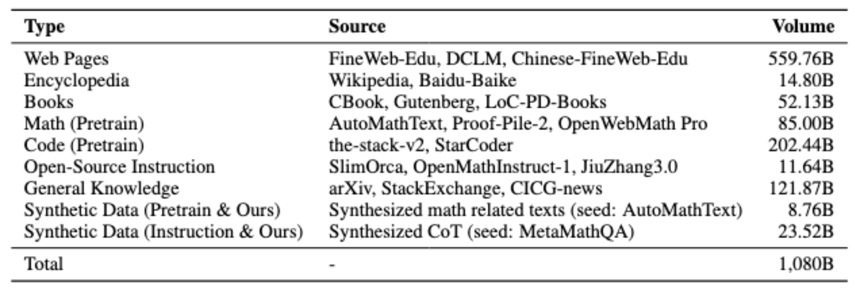 在显著小的语料库(1.08T Tokens)上训练,表现仍具竞争力,数学推理和编程生成表现领先,有效扩展推理数据,通用基准上表现较强,平衡不同能力。