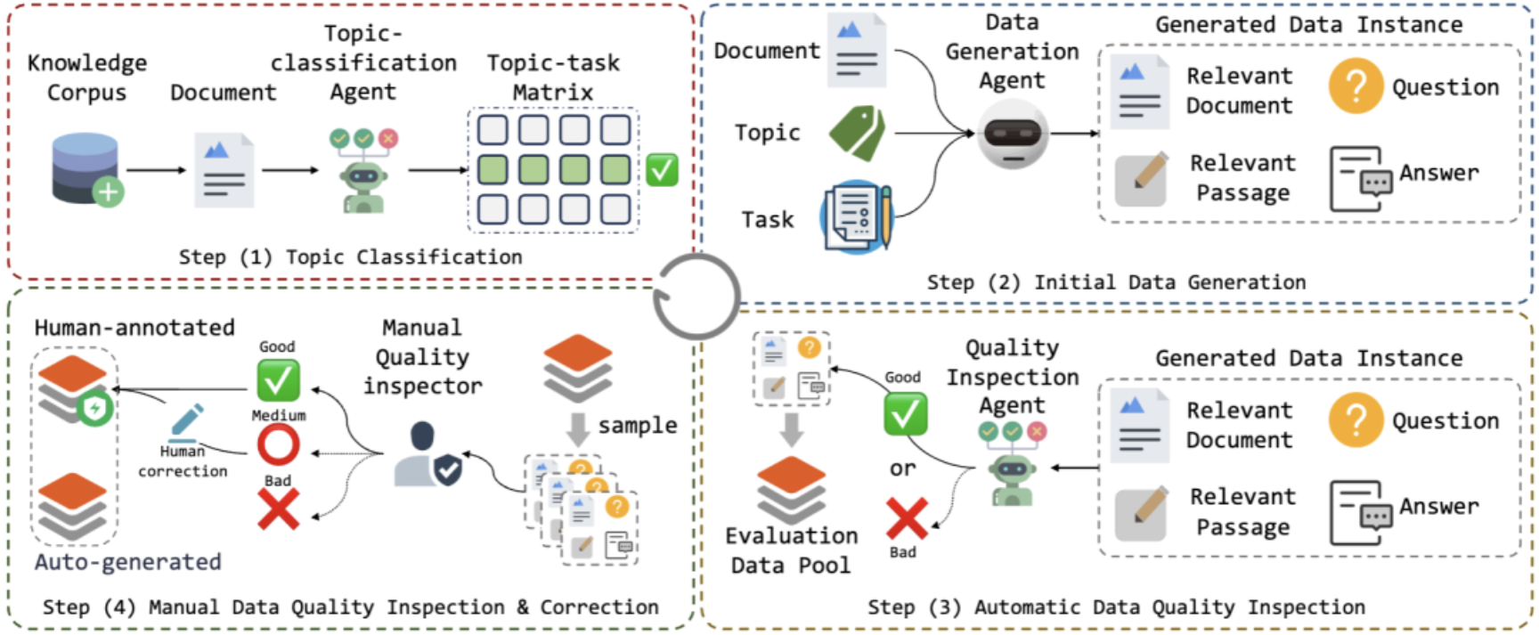 图1:OmniEval评估数据生成流程的可视化。展示了从主题分类、初始数据生成、自动数据质量检查、人工数据质量检查与修正到生成高质量评估数据集的流程。