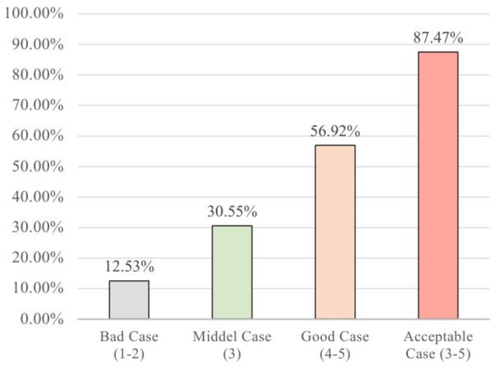 图3:人工检查的统计信息。显示自动生成案例的接受率为87.47%,其中“Good Case”(4 - 5分)占比最高,“Bad Case”(1 - 2分)占比最低,说明自动生成数据的质量总体较好。