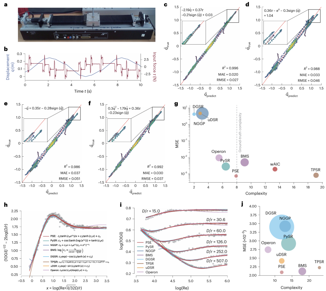图4|用实验数据发现物理规律。通过机电定位系统实验采集数据,对比了多种领先方法的性能。结果显示,PSE方法在预测精度和模型简洁性方面表现最优,能够找到更简洁准确的数学公式。