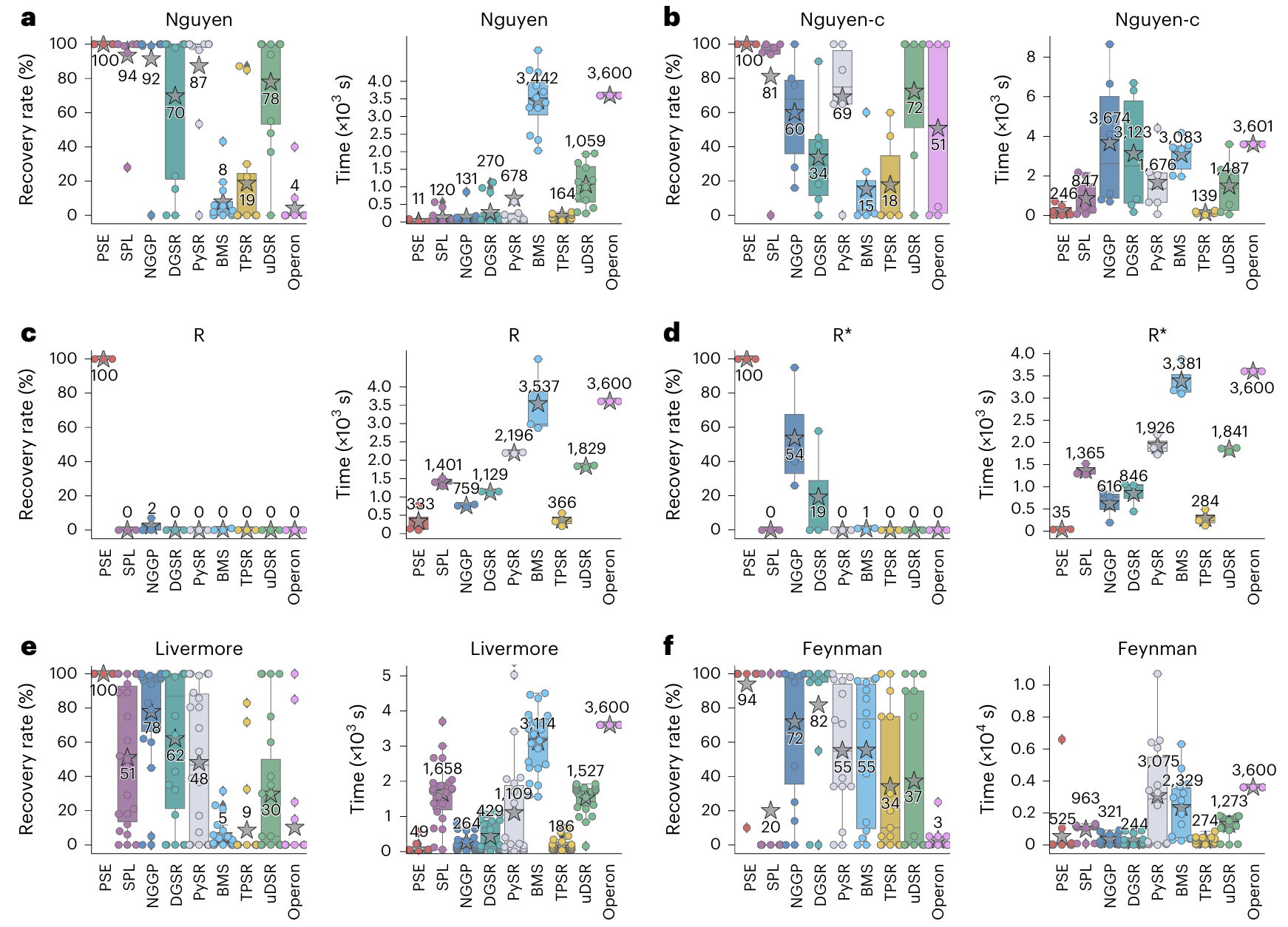 图2 | 各模型在符号回归基准测试中的性能对比。采用符号恢复率(左)和运行时间(右)两项指标评估,PSE方法在所有基准集上均取得最高恢复率且耗时最短。