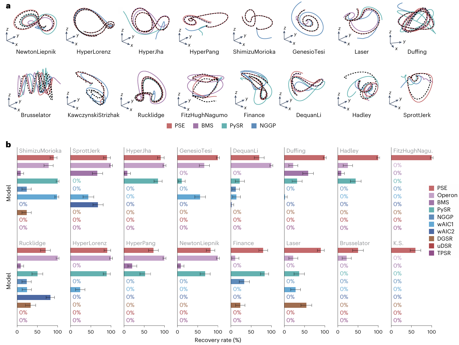 图3 | 不同模型对非线性混沌动力学方程的数据驱动发现对比。在计算时间预算相同的情况下,PSE找到真实控制方程的概率最高。各模型运行时间均限制在10分钟以内。
